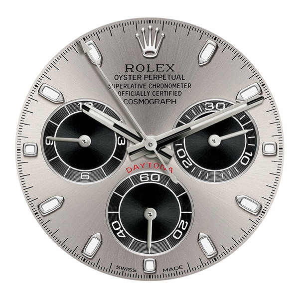 Hour, minute, and second hands in the center, with small seconds (at 6 o’clock). Chronograph and totalizer measuring up to 1/8 second (30 minutes at 3 o’clock and 12 hours at 9 o’clock). Accurate time setting with second hand stop function